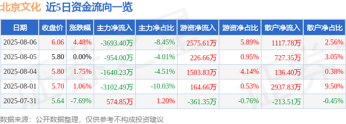 八月六日,北京文化的股價就像一場精心編排的戲碼,高潮迭起,讓人摸不著頭腦。收盤價定格在6.06元,漲幅高達4.48%。這數字背後,是73.31萬手的成交量,以及4.37億元的成交額。數字會說話,但說的往往不是真相的全部。