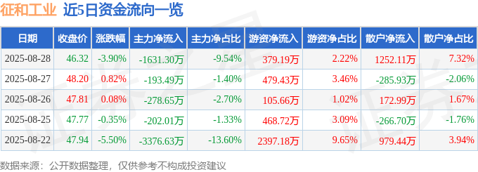 8月28日的資金流向數據,簡直是一部血淋淋的韭菜收割史!主力資金淨流出1631.3萬元,占總成交額的9.54%。這說明什麼?說明那些掌握著大量資金的大佬們,正在不惜一切代價地拋售征和工業的股票。他們可不是慈善家,他們的每一個決定都經過精密的計算,他們的撤退,往往意味著某種風險的預警。而與此同時,散戶資金卻淨流入1252.11萬元,占總成交額的7.32%。看到沒?這就是典型的散戶思維,越跌越買,總覺得自己能抄到底,結果往往是被套在高高的山崗上,動彈不得。股市有風險,入市需謹慎,這句話真的不是說著玩的。你以為你是股神巴菲特,其實你只是待割的韭菜。