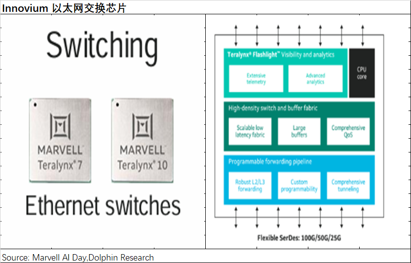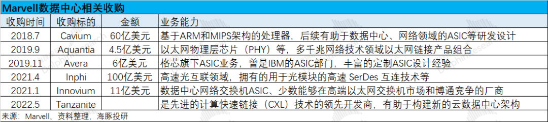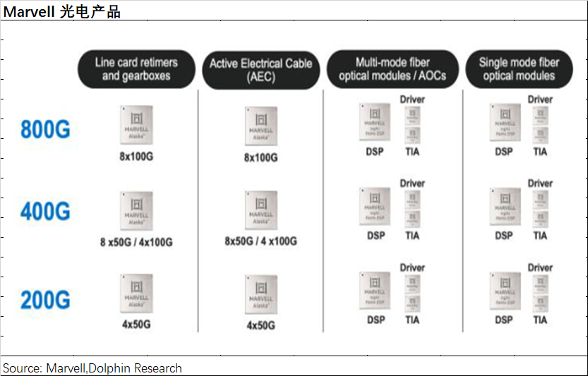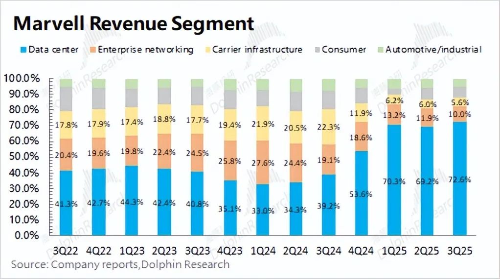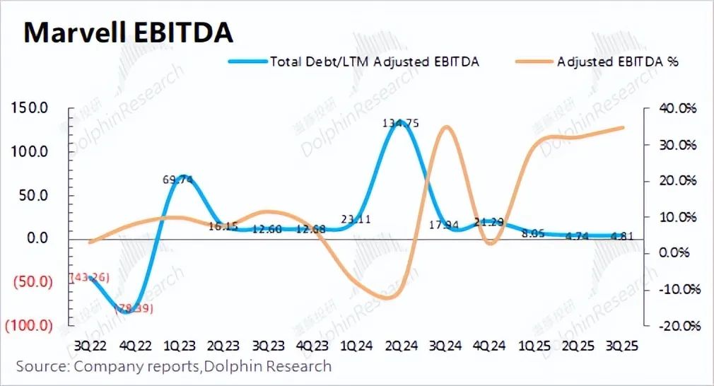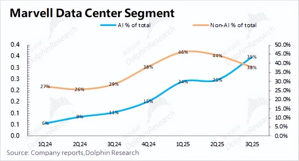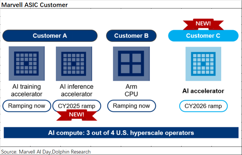在AI算力需求爆炸式增长的背景下,定制ASIC芯片成为市场焦点,Marvell作为ASIC领域核心玩家,其股价也随之水涨船高。 Marvell的数据中心业务,得益于AI需求的强劲驱动,已成为公司最大的收入来源,占比接近70%。然而,公司整体收入增长并不明显,主要受企业网络、运营商基建等传统业务拖累,这些业务均出现两位数下滑。尽管如此,市场仍看好Marvell,主要是因为其数据中心业务,特别是ASIC业务的强劲增长潜力(近三个季度同比增速维持在80%以上)。 Marvell的数据中心业务涵盖ASIC、光电产品、以太网交换芯片和存储产品等。其中,ASIC业务是增长的主要驱动力,预计2024年收入将达到5-6亿美元,大部分为新增量。受益于亚马逊和谷歌ASIC产品的量产出货,Marvell已跻身ASIC设计第一梯队,但市场份额仍为个位数。公司预计2023-2028年ASIC市场复合增长率为45%,而Marvell自身的市场份额有望超过20%,这意味着公司ASIC收入的复合增长率将超过45%。 除ASIC外,Marvell的数据中心其他业务也表现出色。光电产品方面,公司在光模块DSP芯片市场占据领先地位,预计2023-2028年复合增长率为27%;以太网交换芯片方面,公司产品虽然略逊于博通,但仍处于第一梯队,预计2023-2028年复合增长率为15%;存储产品方面,公司专注于企业级SSD主控芯片,预计2023-2028年复合增长率为7%。 Marvell的AI技术主要源于其战略性的并购,通过收购Cavium、Aquantia、Avera、Inphi和Innoviun等公司,公司迅速构建了在数据中心市场定制ASIC及网络互联的关键能力。 尽管并购带来了债务,但Marvell的“Total Debt/LTM Adjusted EBITDA”比值已回落至4.8倍左右,公司正致力于提升经营能力,以降低债务水平。 Marvell的股价上涨,一方面源于公司成功转型,数据中心业务收入占比达到70%;另一方面源于市场对ASIC赛道高增长潜力的预期。未来,Marvell的业绩将持续受益于ASIC及数据中心业务的增长。